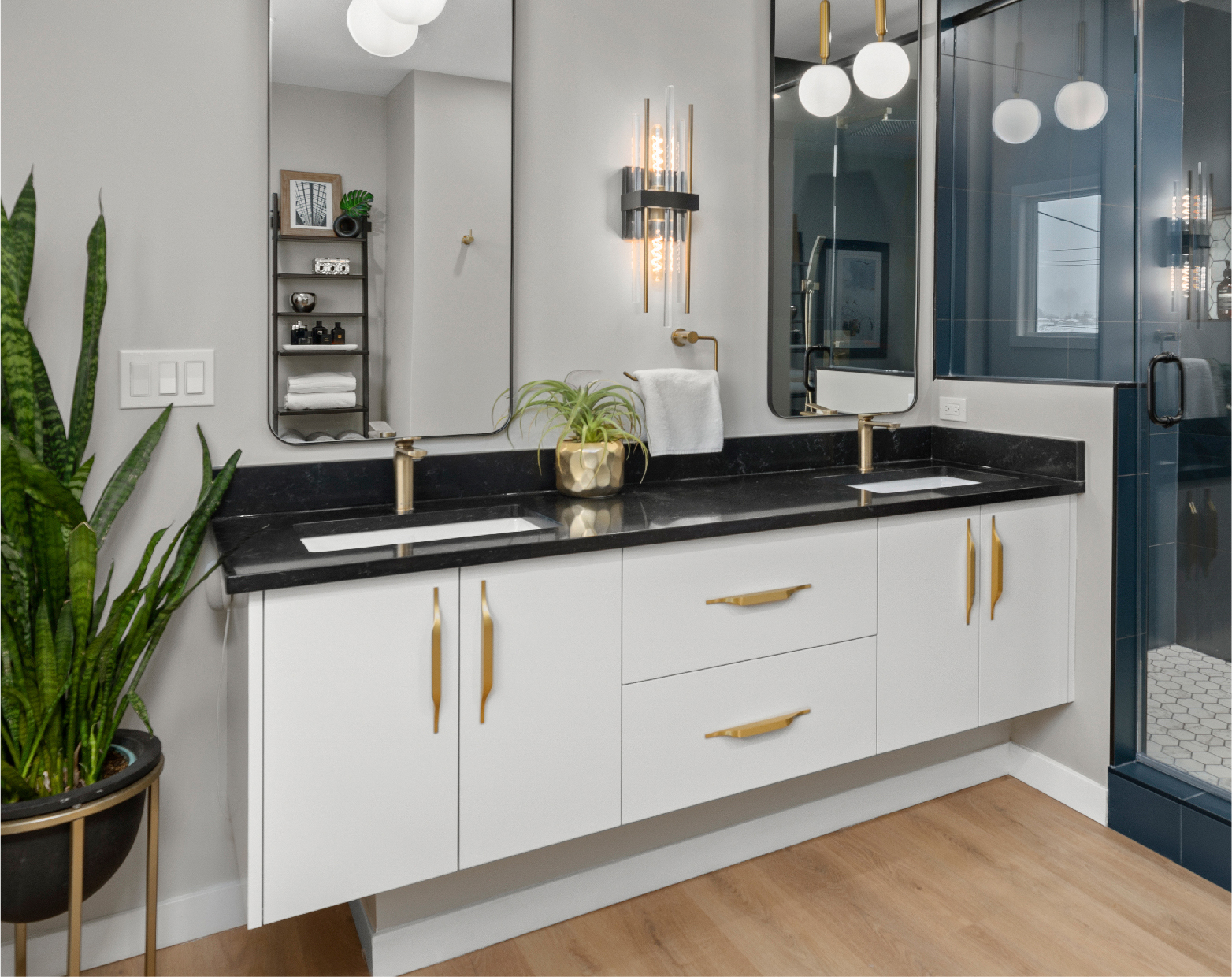 - Vanities: Another simple yet effective update can be the bathroom vanity. This piece not only serves as a stylish focal point but can be a crucial storage space for all of the common toiletries that tend to clutter the room. A new mirror, lighting fixtures, and organizers can all be added to really make an impact!
