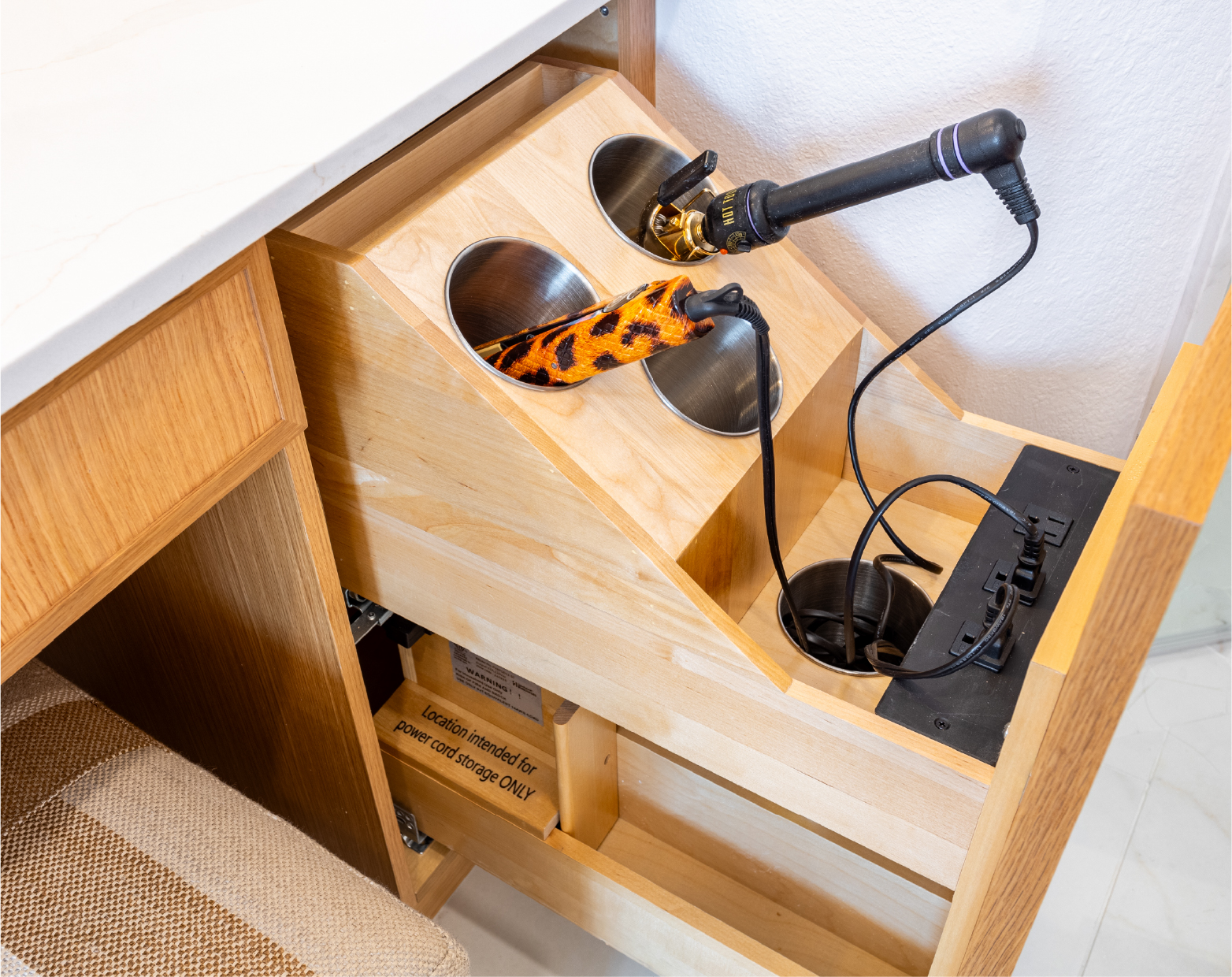 - Install floating shelving or hidden storage to keep clutter tucked away. Bath Tune-Up offers pull-out organizers and powered drawers ideal for toiletries and hair appliance.