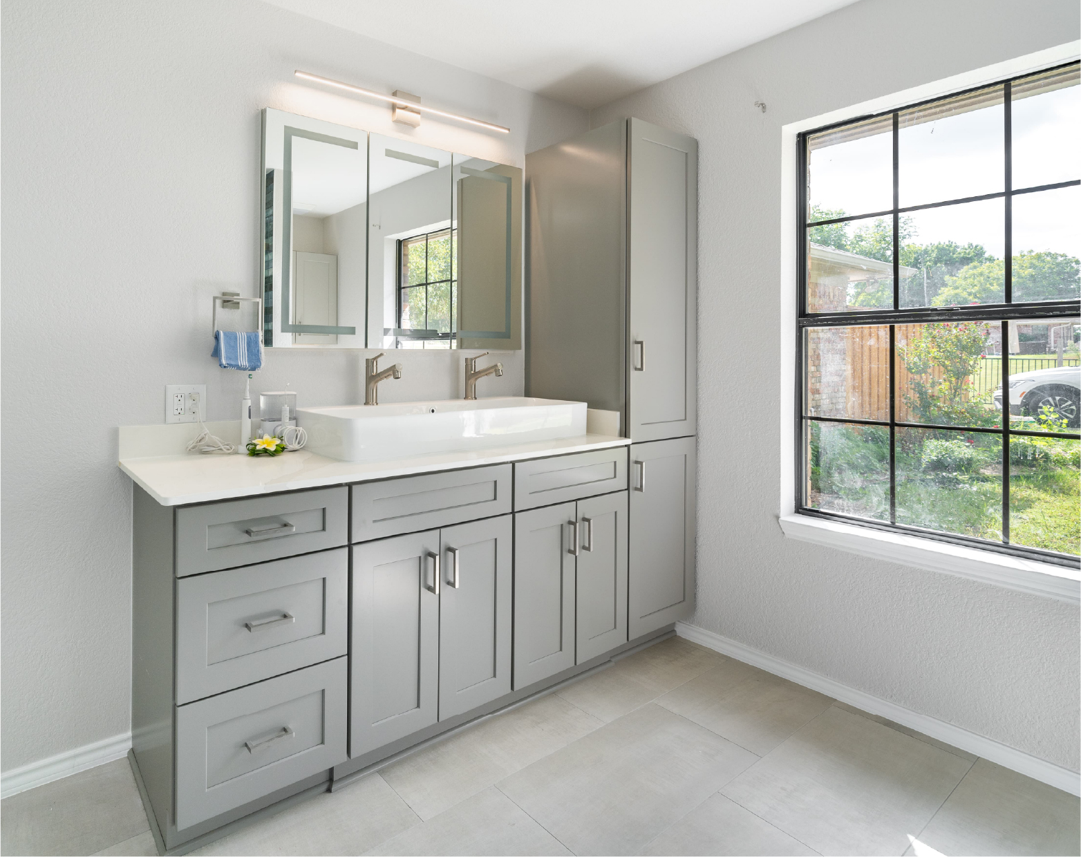 Inside the shower, we installed a foldable bench and strategically placed grab bars, offering both convenience and peace of mind. These additions allow the homeowners to shower with confidence and independence—while also maintaining a clean, modern look that complements the overall design. A smaller freestanding tub was added, giving the couple the option of soaking while still conserving space. Lighting was upgraded to include stylish LED fixtures and a sleek medicine cabinet mirror that elevates both functionality and aesthetics.
