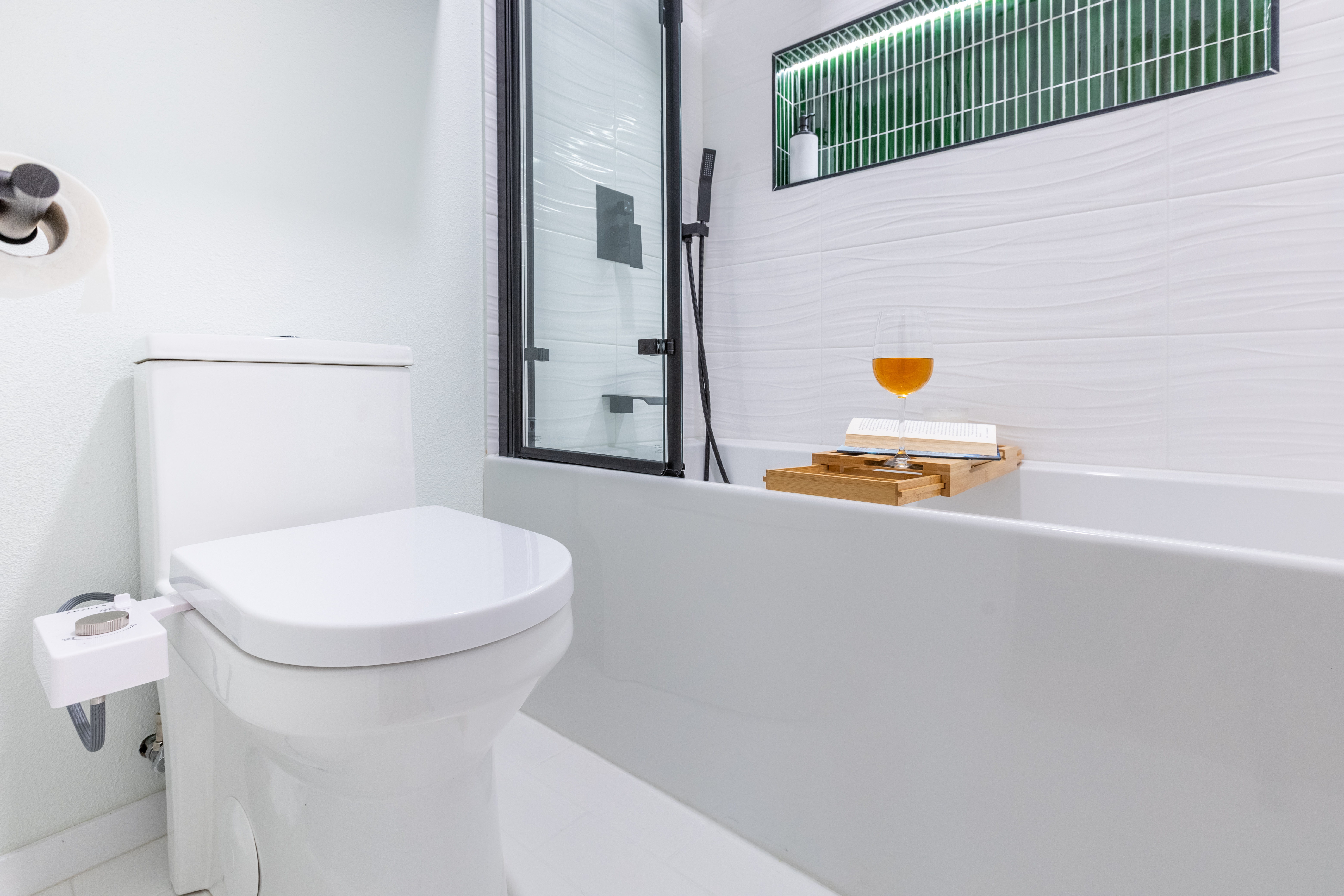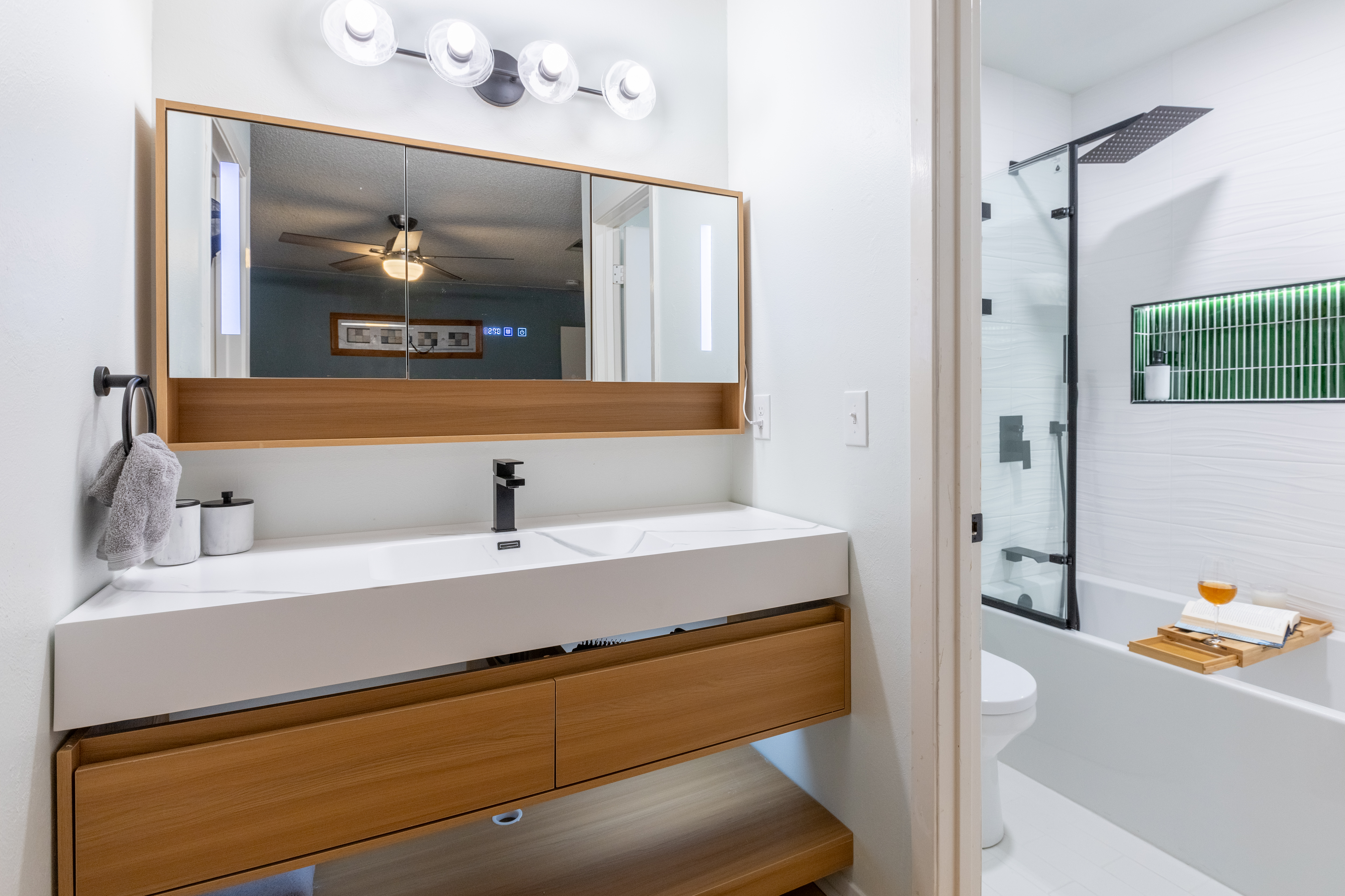This exquisite bathroom remodel in Austin, TX showcases a fresh, modern aesthetic with transitional elements. The vanity was updated to a warm wood centerpiece, offering an a natural touch. It pairs nicely with the sleek black and whites of the tile shower, complete with a lighted niche for added ambiance, color pop and practicality. Complementing these features is an elegant alcove tub, seamlessly blending comfort and sophistication to create a tranquil retreat.